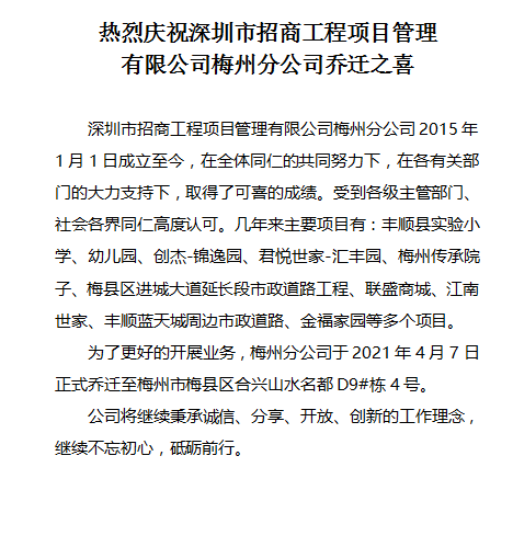 热烈庆祝深圳市招商工程项目管理 有限公司梅州